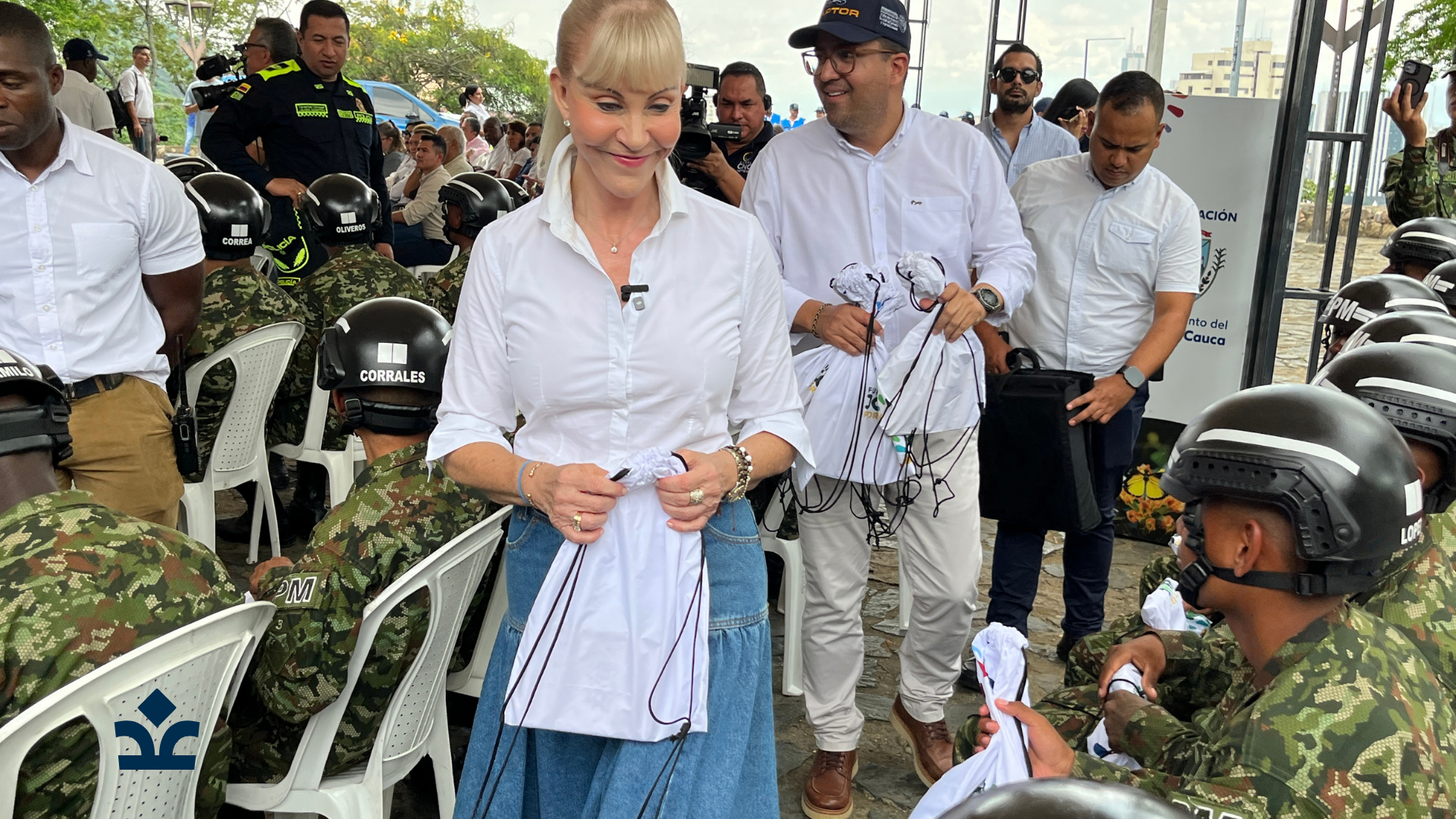 Durante el encuentro, la Gobernadora Dilian Francisca Toro compartió con los jóvenes que actualmente se encuentran en proceso de formación y servicio. En ese espacio se realizó la entrega de kits del programa, un apoyo que reconoce su compromiso con la seguridad y el bienestar del departamento.